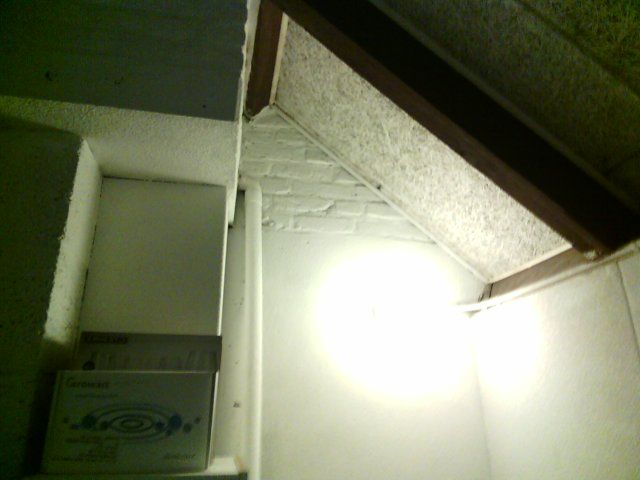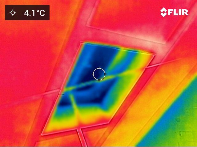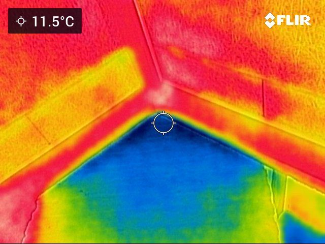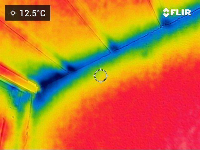 De matige isolatie van het dak is goed zichtbaar. Warmte van verwarmingsleidingen verwarmen achter het knieschot is zichtbaar.