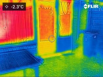 Zowel de deur als de muur naar de hal zijn koud doordat de temperatuur is de hal lager is en de muur daartussen niet geïsoleerd. Let ook op de kierdichting.