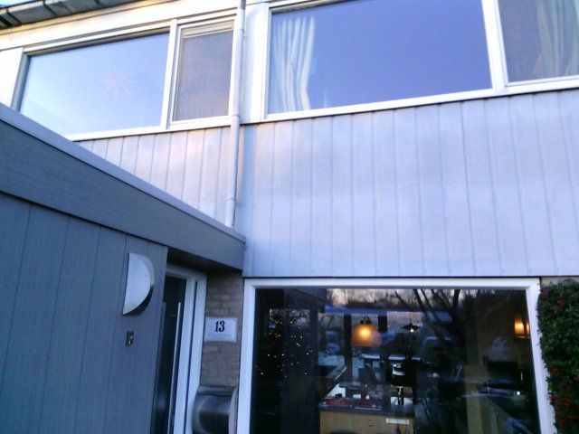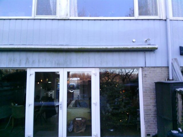 Slecht isolerend glas, warmteverlies boven het kozijn, de voordeur en het houten deel van de uitbouw verliezen veel warmte.