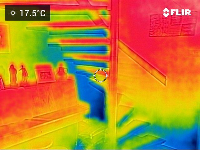 Precies achter deze niet/slecht geïsoleerde muur bevinden zich verwarmingsbuizen. De muur verliest hierdoor extra veel warmte.
